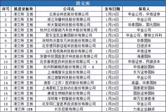 1月19日-1月26日,港交所有18家公司递交主板上市申请,1家公司递交GEM上市申请。