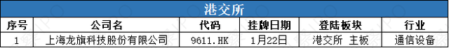 1.龙旗科技:全球智能产品和服务提供商,为全球知名智能产品品牌商和领先的科技企业提供解决方案-包括产品研究、设计、制造及支持。上市首日收涨3.55%,截至1月26日收盘报31.000港元/股,与发行价31.00港元/股持平,总市值约263亿港元。