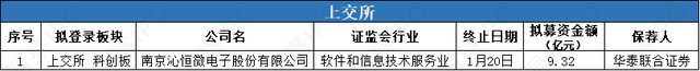 1月20日-1月26日,上交所科创板有1家公司终止上市审核;深交所无公司终止上市审核。